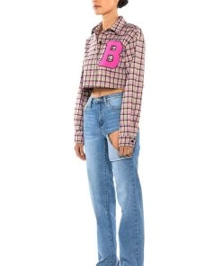 Varsity chic, The AKIRA Label Plaid B Long SLeeve Blouse is made from a lightweight, plaid fabrication and features a foldover collar and long sleeves with button cuffed hems. Complete with a button-down front closure, a large letter B patch, and a cropped silhouette. Pair with relaxed denim cargos and combat boots, for an everyday look!