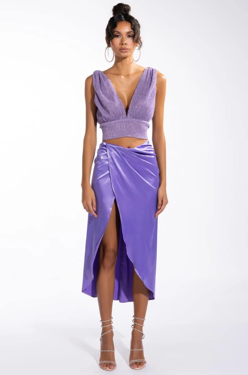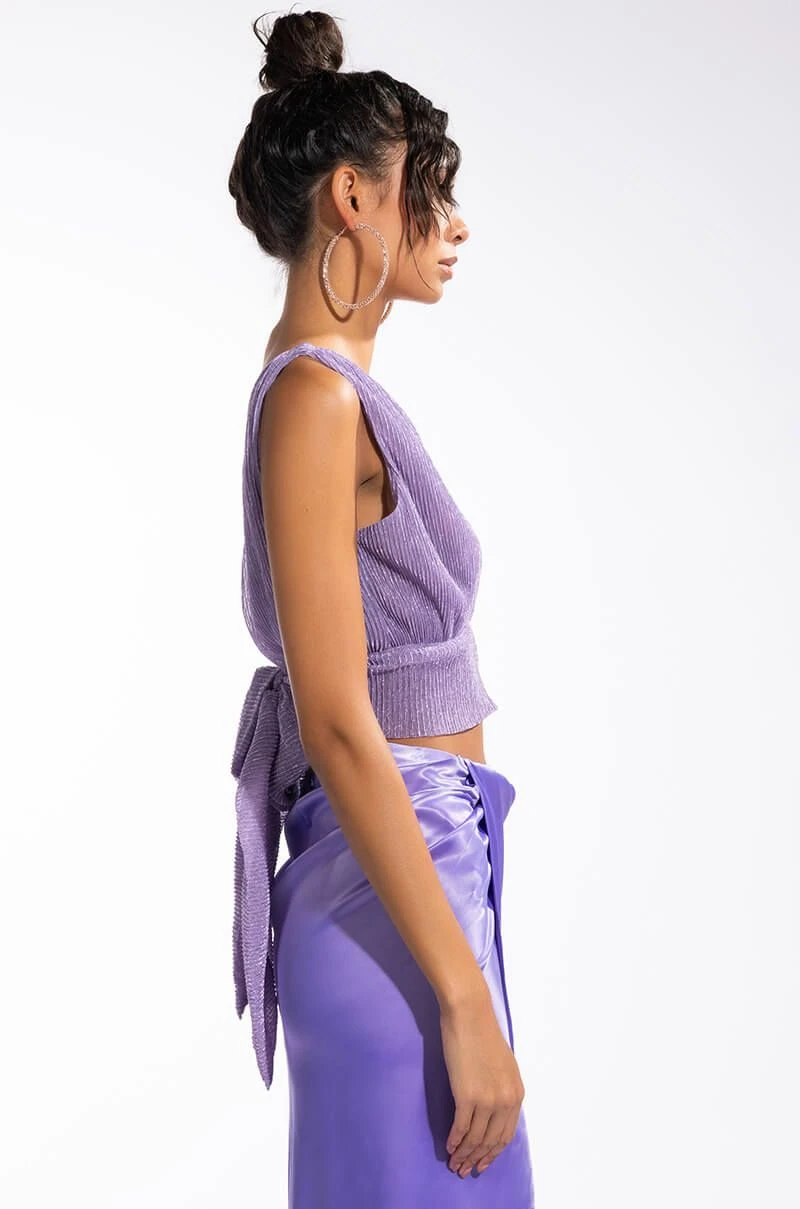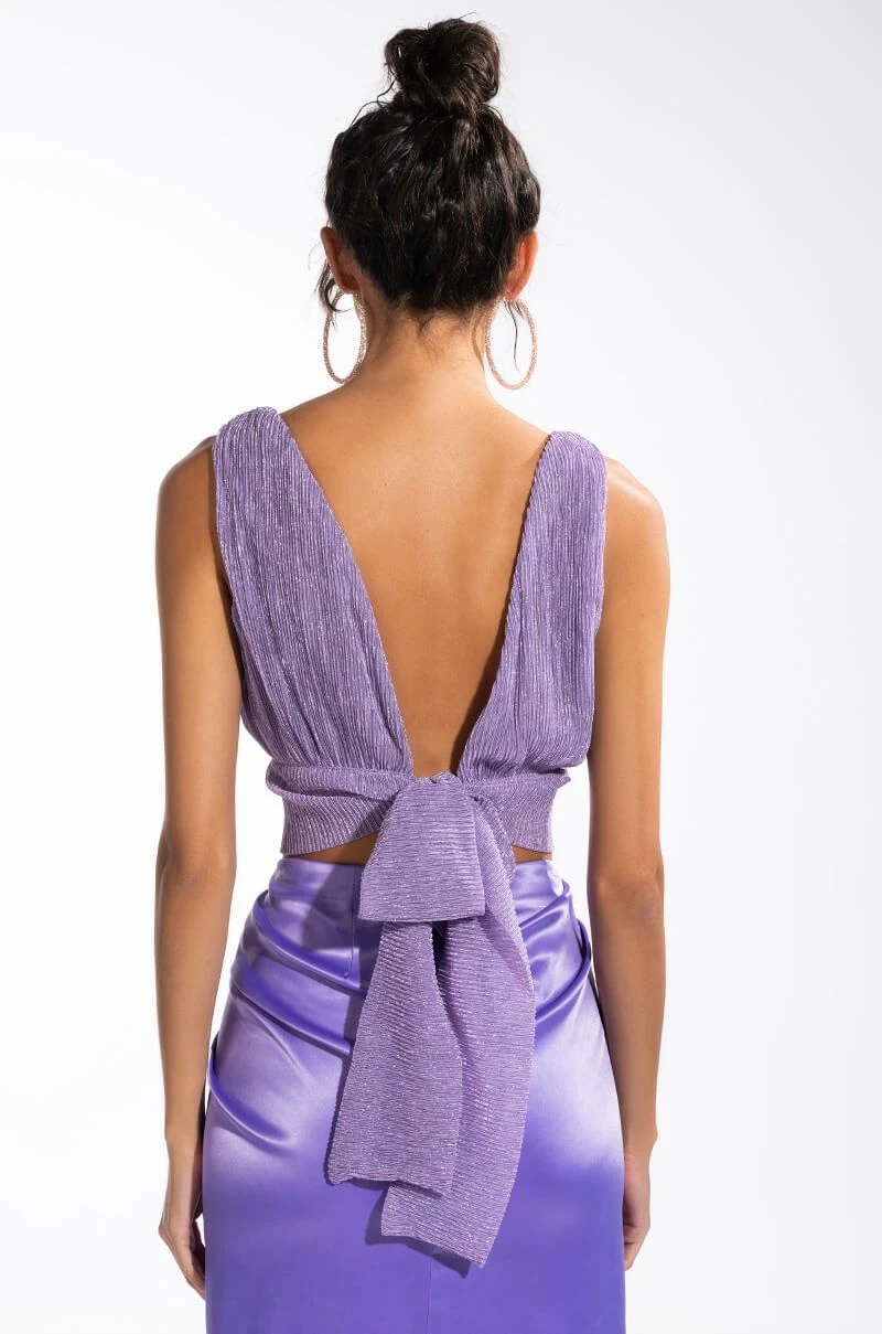 The AKIRA Label Poised Sleeveless V Neck Peplum Blouse is made from a semi-sheer, glittery pleated chiffon fabrication and features a plunging V neckline, sleeveless silhouette, cropped length, a peplum hem, and a tie back closure. Pair this glitzy piece with wide leg bottoms and mules to complete your shimmering going-out look!