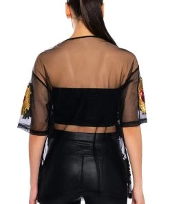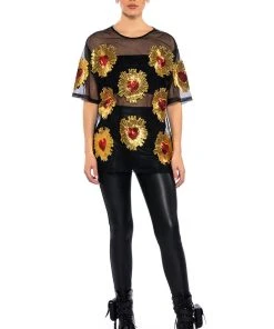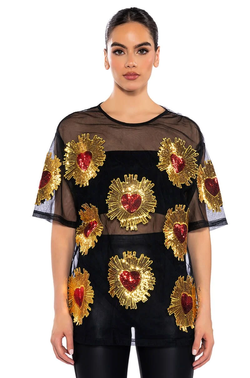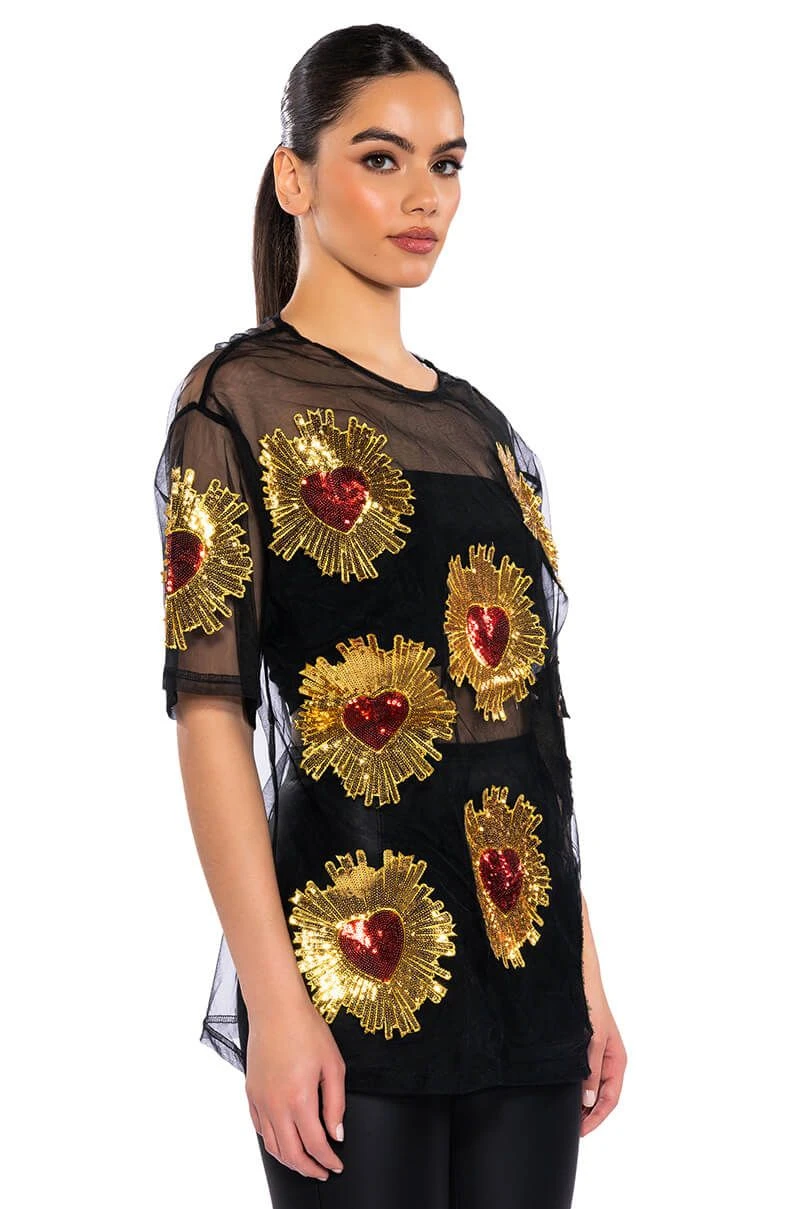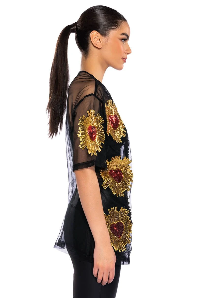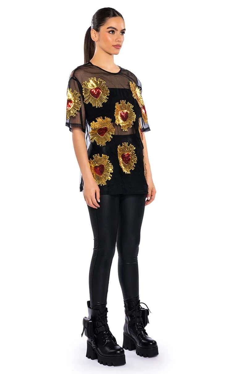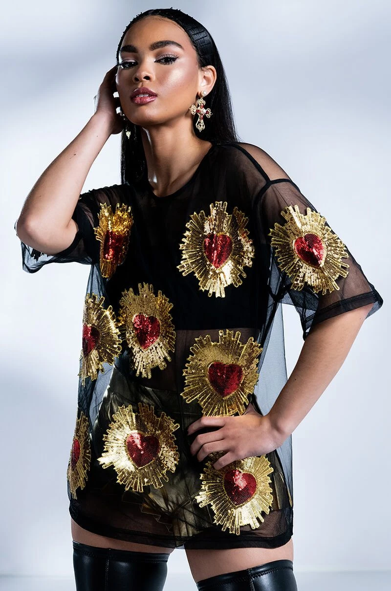 Show off your poker face in The AKIRA Label Queen Of Hearts Oversized Mesh Tee. This sheer top features a casual oversized cut, a crew neckline, short sleeves, sequin embroidered heart detailing, and a sheer mesh fabrication. Wear with biker shorts, high top sneakers, and oversized hoops.