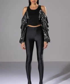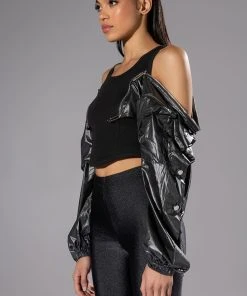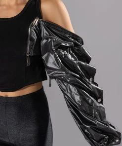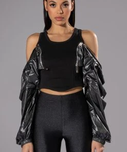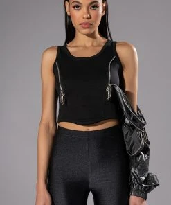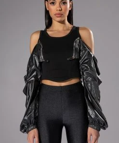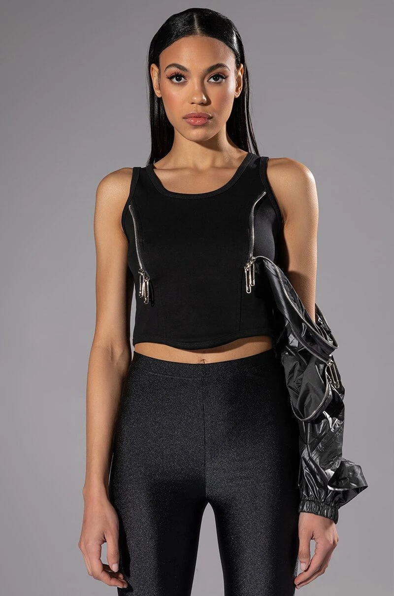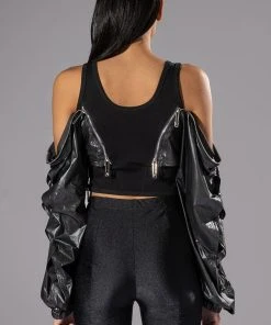 Would you ride or die for this top? We would! The AKIRA Label Ride For You Pu Sleeve Zipper Detail Top is made from a cotton base fabrication, tank straps, a pointed hem with seams, and PU contrast faux zipper off-the-shoulder sleeves. Complete with silver buttons along the sleeves, elastic hems at the wrist, faux safety pin zippers, zippered back shoulder pockets, and a cropped silhouette. Pair this top with skinny jeans and knee-high boots.