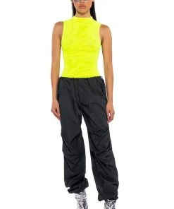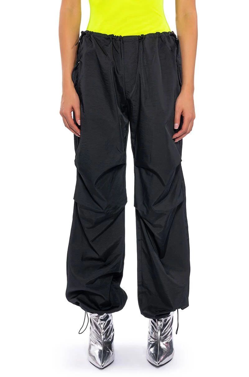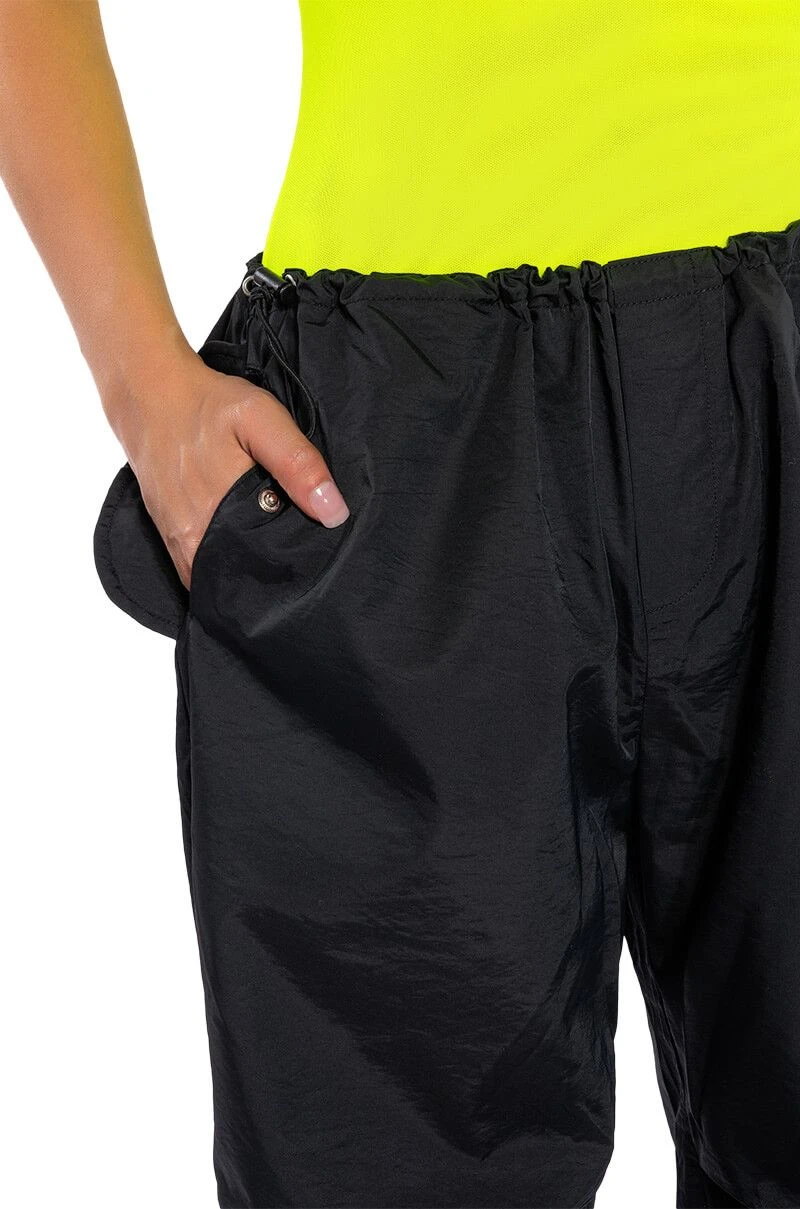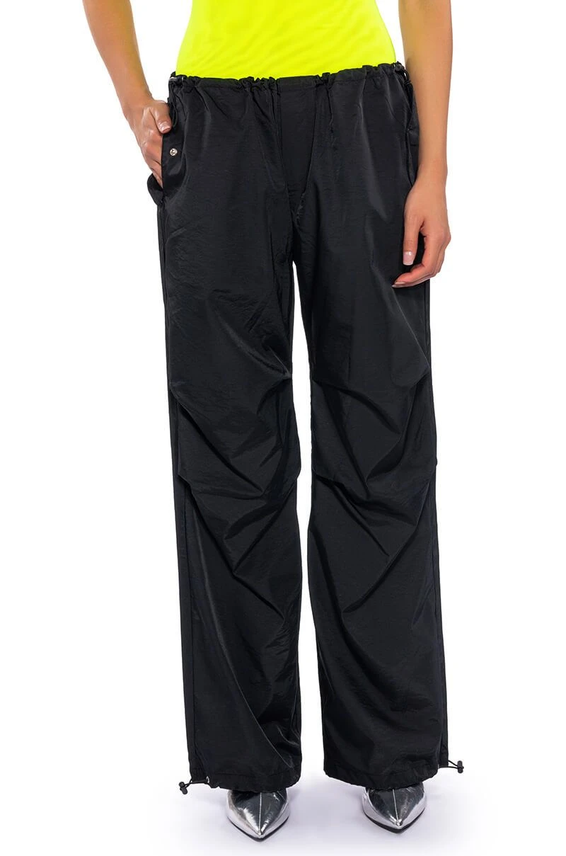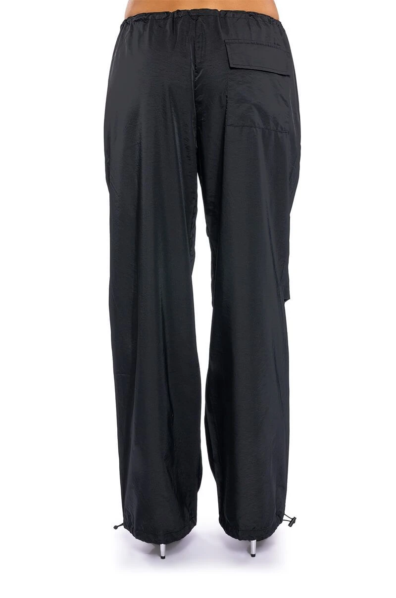 The AKIRA Label Riley Wide Leg Parachute Pant is made from a slick, lightweight windbreaker fabrication and features a high rise toggle drawstring paperbag waist, slant snap button flap side pockets, a wide leg, relaxed fit, a flap back pocket, and toggle drawstring ankle hems. Pair this piece with a bomber jacket and chunky sneakers to complete your look.