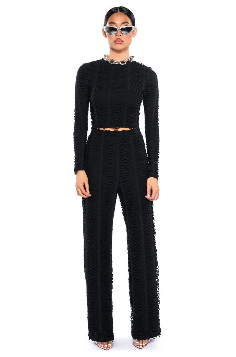 The AKIRA Label Running With The Wolves Textured Pant is made from a soft and stretchy knit fabrication and features a high rise waist, an elastic waistband, a shredded texture top layer, a straight leg silhouette, and a pull-on fit. Pair this piece with the matching AKIRA Label Running With The Wolves Textured Top to complete your look.