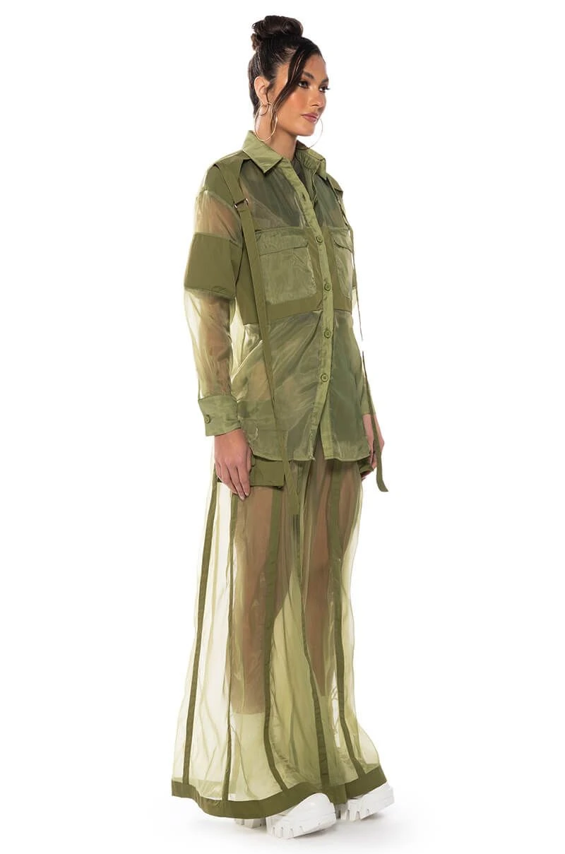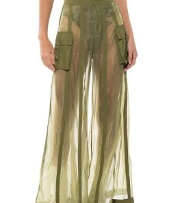 The AKIRA Label Sage Wide Leg Trouser is part of a flowy chic two-piece set, made from a sheer, polyester base fabrication and featuring a striped mesh paneling design, a high waist, buckled cargo flap pockets on the sides, and elastic at the back waist for a more comfortable fit. Complete with an extra wide leg silhouette and a zip-up to hook-and-eye front closure. Style with the coordinating top, The AKIRA Label Sage Button Down Shirt, for a finished look.