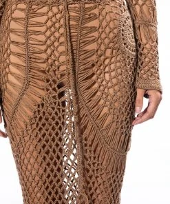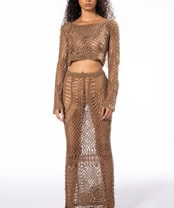 The AKIRA Label Sand Dunes Long Sleeve Crochet Top And Maxi Skirt Set is made from an unlined crochet base and features a long sleeve top and maxi skirt. The long sleeve top features intricate crochet patterning, a scoop neckline, long sleeves, and a cropped silhouette. The maxi skirt features coordinating intricate crochet patterning, a high rise waist with crochet drawstring detailing, a sexy bodycon fit, and a maxi length silhouette. Wear these pieces separately or style them together for all of the crochet charm!