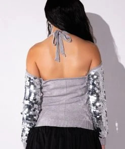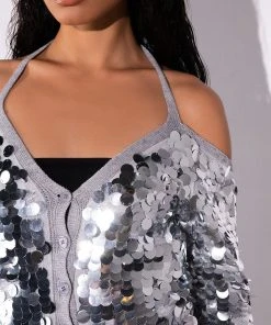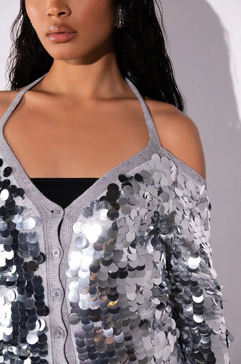 The AKIRA Label Satisfy Me Sequin Cold Shoulder Top is a knit cardigan-style piece featuring a mesh overlay, a sequin-embellished front, a cold shoulder silhouette, long sleeves, and a button up front closure. Complete with a tie-front accent and ribbed knit trim.