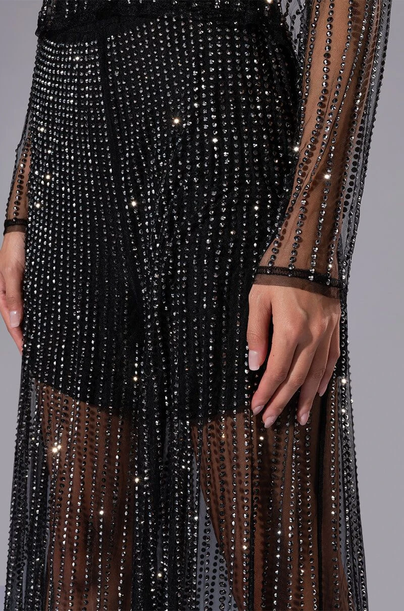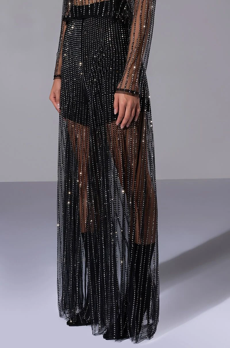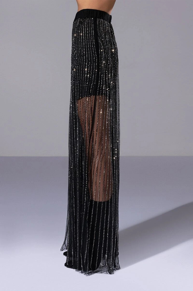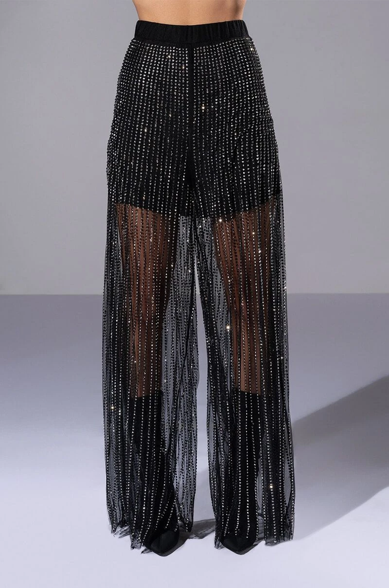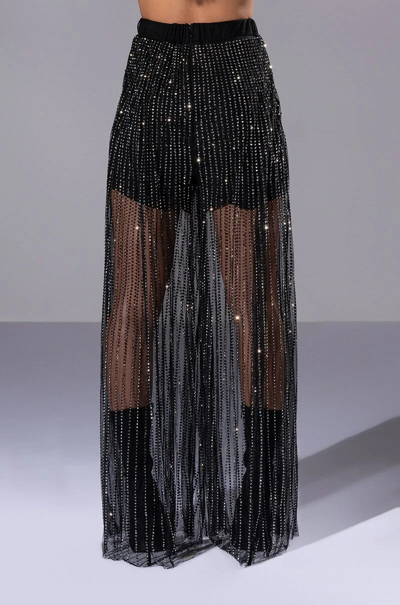 We’re in LOVE with The AKIRA Label Glam Night Out Mesh Wide Leg Pants! These bottoms are made from a sheer mesh fabrication and feature all over shiny striped rhinestone embellishments. Complete with a high waist rise, elastic waistband, built in