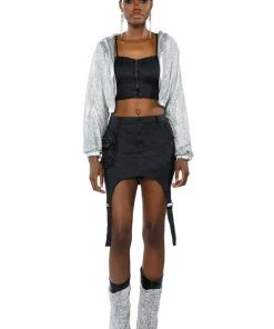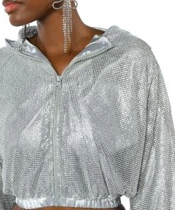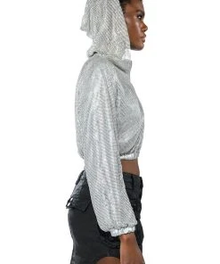 The AKIRA Label Shine Star Rhinestone Chainmail Crop Hoodie is made from a glistening rhinestone chainmail base and features an attached hood, long sleeves, a cropped silhouette, elastic hems, and satiny lining. Complete with a front zipper closure. Pair this piece with wide leg cargo pants and chunky sneakers to finish off your stardom-ready look.