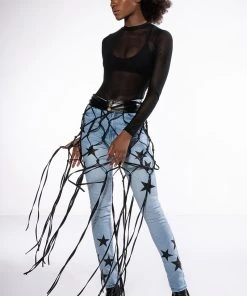 The AKIRA Label Shining Star Patch Detail High Rise Skinny Jean is made from a washed denim fabrication and features a high rise waist, working belt loops, a classic five-pocket design, whiskering on the upper thighs, stitched vegan leather star patch detailing, and a skinny leg silhouette. Complete with a button and zipper front closure.