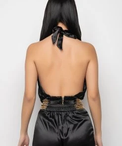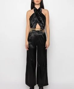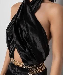 We’re living our Parisian fantasy in The AKIRA Label Sil Vous Plait Chain Detail Cropped Halter Blouse. This top is made from a lightweight satin fabrication and is complete with pleated detailing, a tie halter neckline, an open front design, layered chain links at the hem, and a shirred elastic backband with a small zipper closure. Complete your look with the matching AKIRA Label Sil Vous Plait Chain Detail Palazzo Pant.