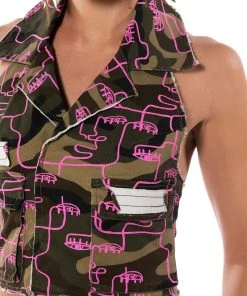 The AKIRA Label Silhouette Print Camo Collared Halter Top is made from a stretchy cotton fabrication and features a camo print with a graphic print silhouette overlay, a collared halter neckline, a sleeveless silhouette, front flap cargo pockets, a sexy open back, a cropped length, distressed hems, and an exposed back zipper closure. Pair this piece with the coordinating AKIRA Label Silhouette Print Camo Cargo Pant and combat boots to complete your look.