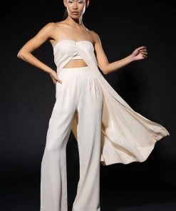The AKIRA Label So True Strapless Top is made from a smooth fabrication and features a strapless design, an inner bralette with padded cups and an elastic hem, a cascading open front, a longline silhouette, and a tonal back zipper closure. Style this piece with the coordinating AKIRA Label So True Palazzo Pant to complete your look.
