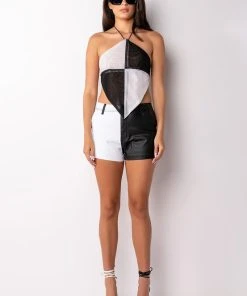 The AKIRA Label Spitfire Mesh Halter Crop Top is made from a sheer mesh fabrication and features a bold geometric pattern in a two-tone colorway, a tie halter neckline, a pointed handkerchief top design, cropped silhouette, an open back, and a tie back closure.