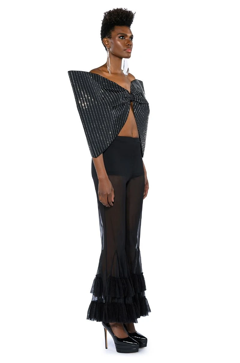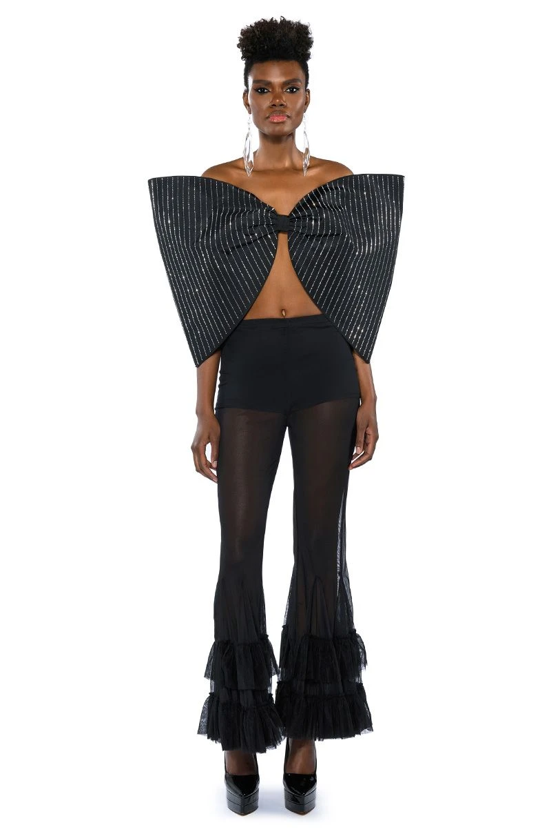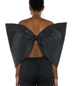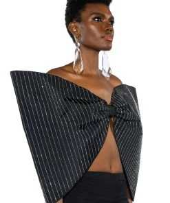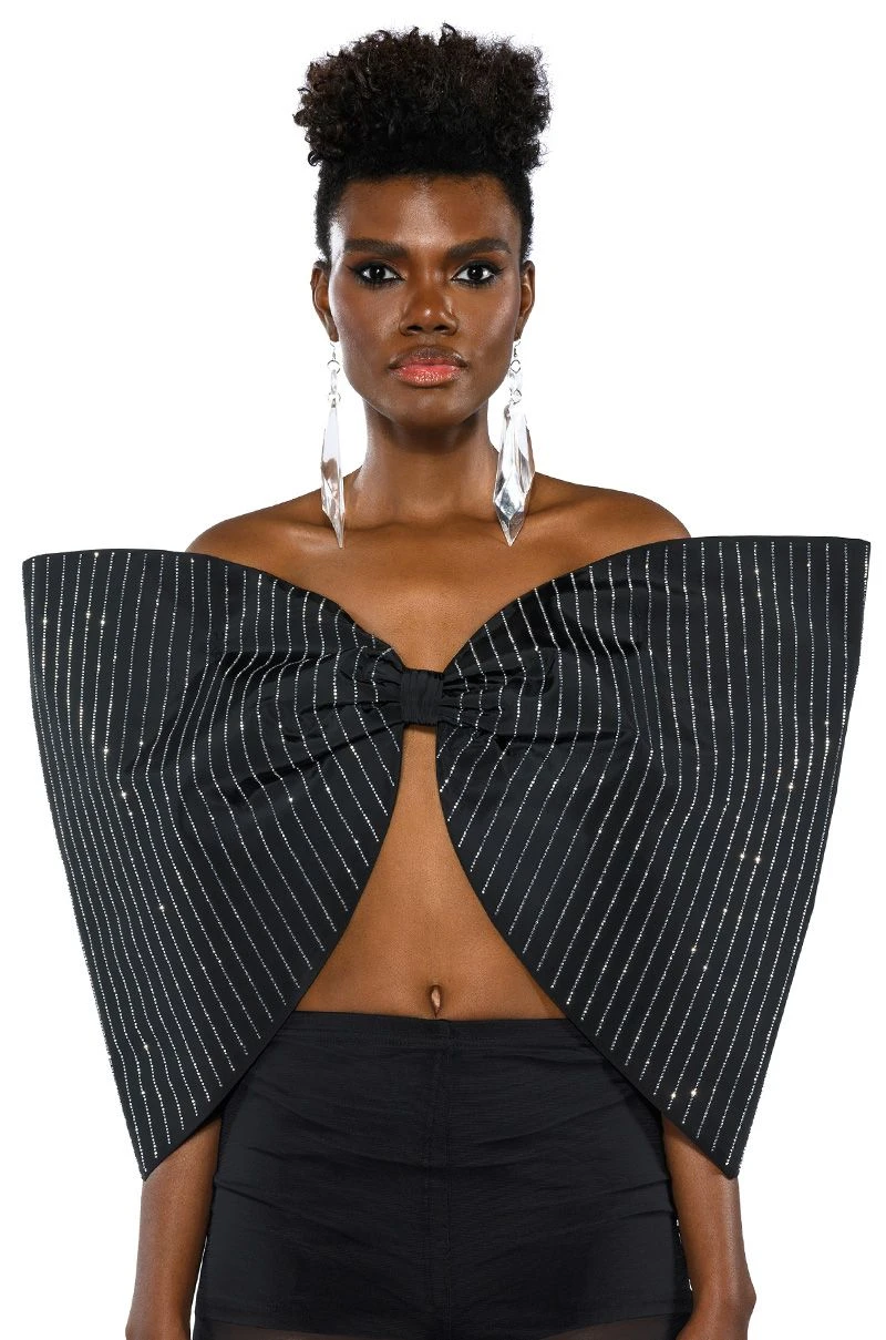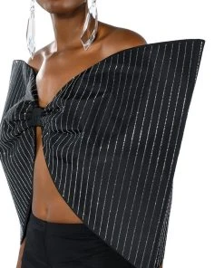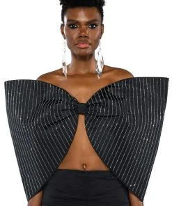 The AKIRA Label Standing Ovation Pinstripe Rhinestone Dramatic Bow Top is made from a slick fabrication and features a strapless sweetheart silhouette, pinstripe rhinestone detailing, a large, reinforced bow design, a sexy open back, elastic shoulder bands for structure, and a pull-on fit. Pair this piece with pant boots and gloves to complete your extravagant look.