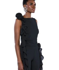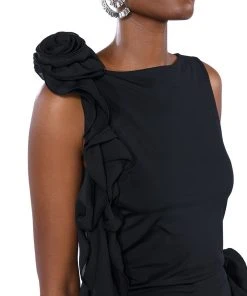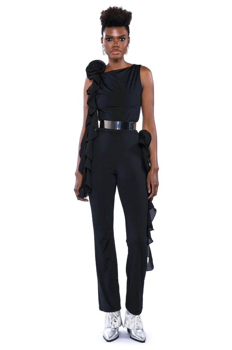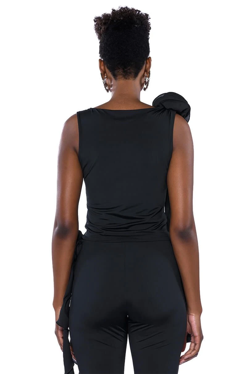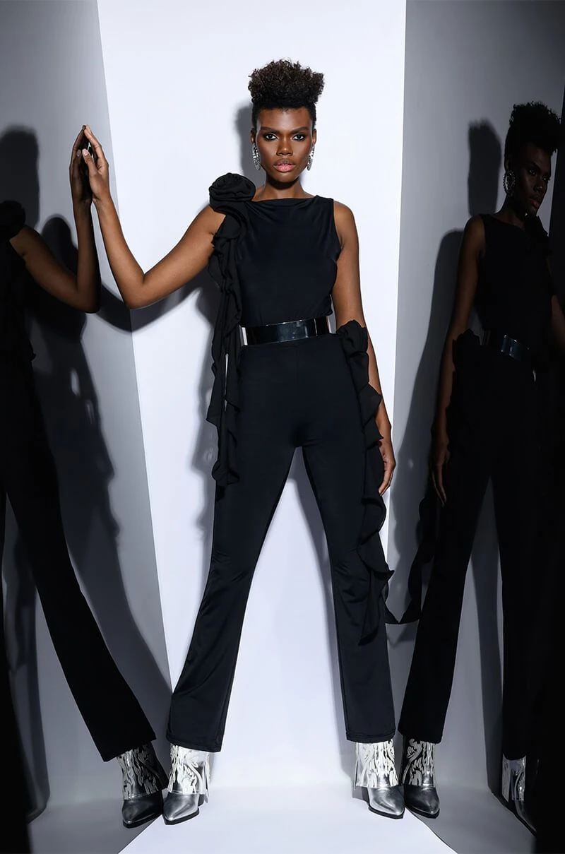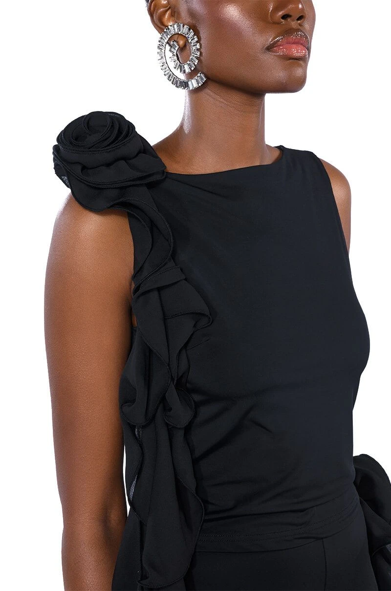 The AKIRA Label Stella Flounced Sleeveless Top is made from a sleek, stretchy base fabric and features a boat neckline, a bodycon fit, and a flouncy, mesh floral applique with a cascading ruffle detail on the shoulder. Complete with a sleeveless silhouette and a slip-on design. Style with the matching bottoms, The AKIRA Label Stella Flounced Flared Legging, for that chic, it-girl look.