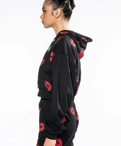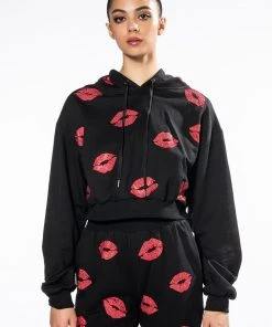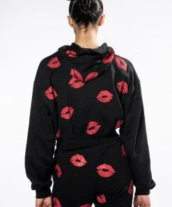 We have strong feelings for The AKIRA Label Superlove Hoodie. This cozy sweater features an attached drawstring hood, long sleeves, and a slightly cropped, boxy silhouette. Complete with lipstick kiss print patterning and tonal rhinestone detailing. Pair this piece with the matching AKIRA Label Superlove Jogger and platform sneakers to complete your look!