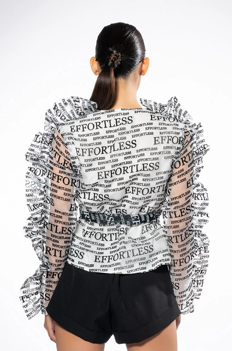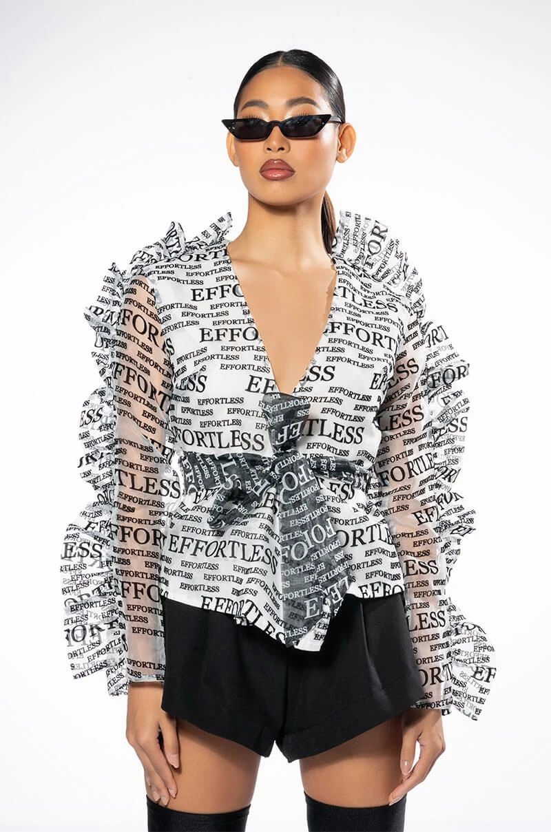 The AKIRA Label That New News Ruffle Long Sleeve Blouse features a lined chiffon fabrication, a plunging neckline, long ruffle trim blouson sleeves, and a self-tie waist belt. Complete with “Effortless,” velvet burnout text print patterning, a cinched waistline, and a waist length silhouette. Style with distressed denim, and sleek ankle booties for a complete look.