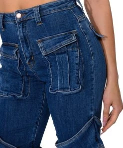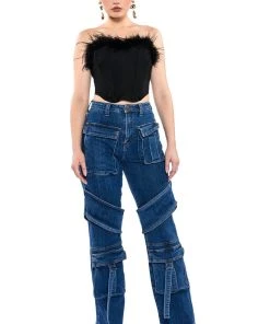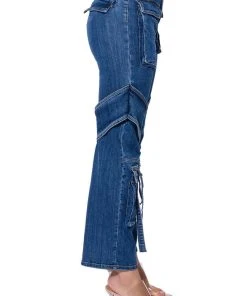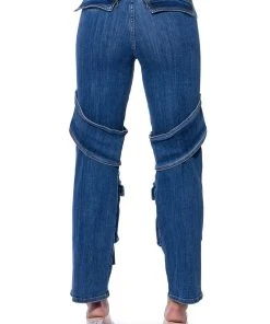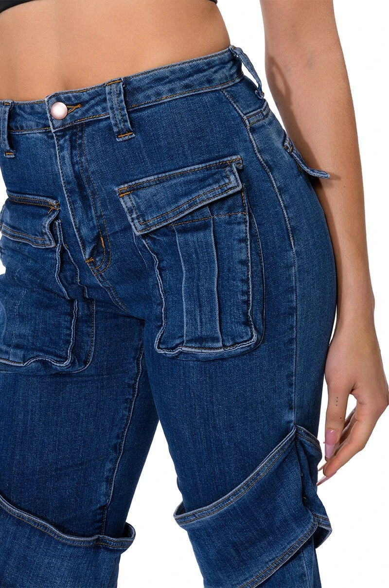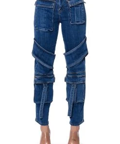 Denim on denim on denim! The AKIRA Label Too Cool Cargo High Waisted Jeans features a denim base fabrication, complete with a high waisted silhouette, cargo flap and belted pockets, working back pockets, a sexy belted wrap at the thighs, and a straight leg fit. Pair with embellished platform heels and turtleneck for an edgy, chic look!