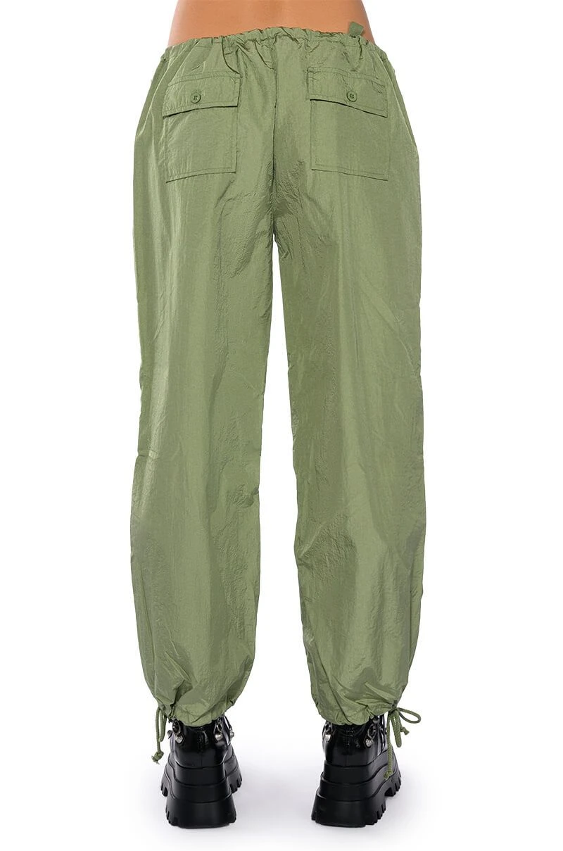 The AKIRA Label Too Legit Wide Leg Cargo Pant in Green is a lightweight parachute pant featuring a windbreaker-inspired fabrication, a high rise waist, button flap slant side pockets, and a drawstring waistline. Complete with tonal drawstring hems detailing.