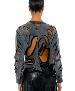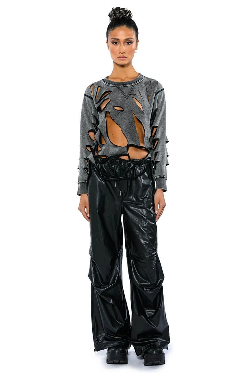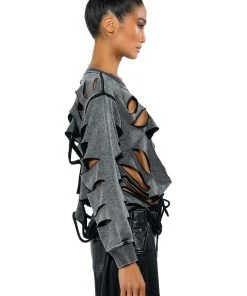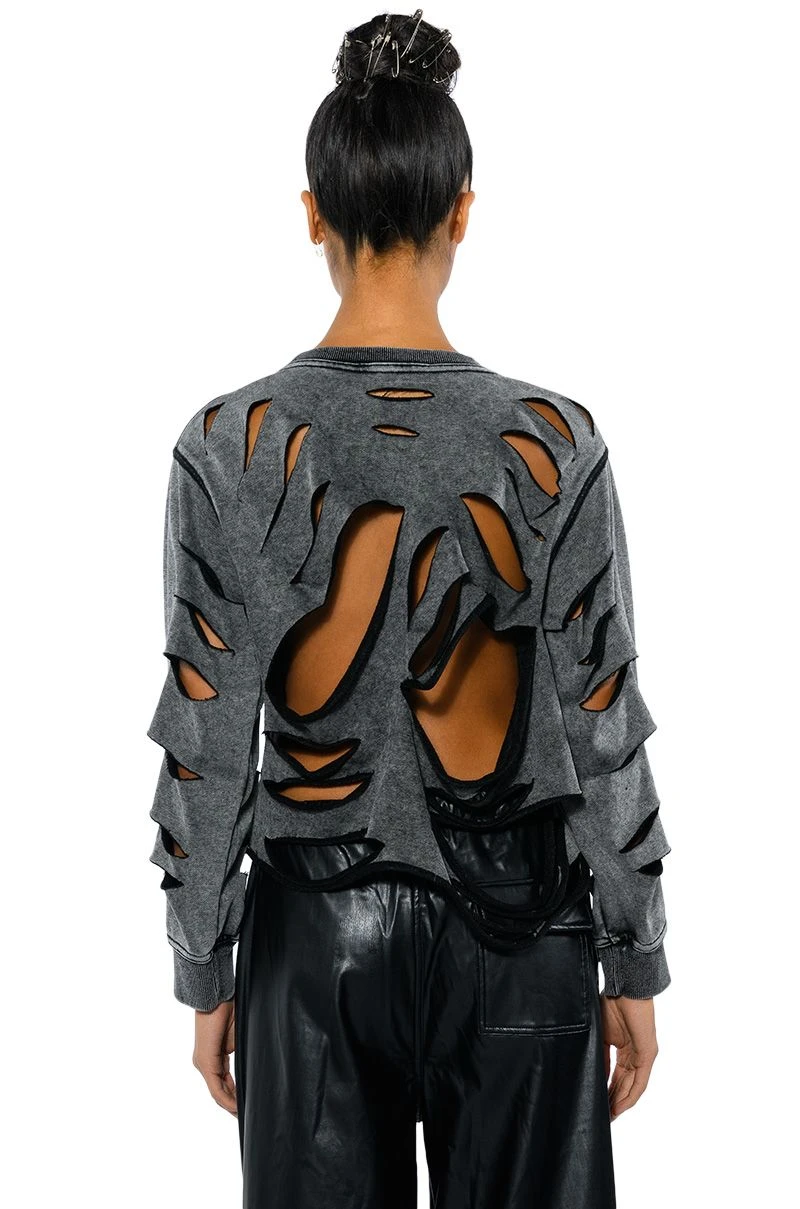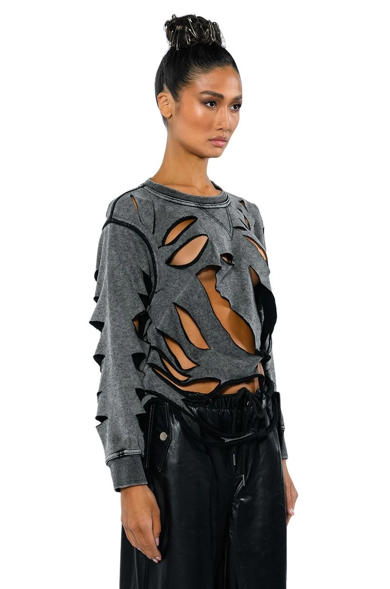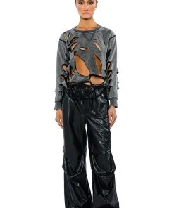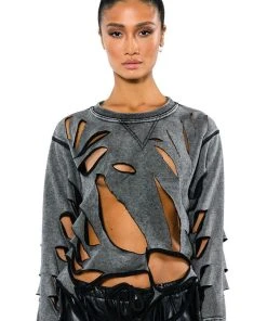 The AKIRA Label Torn Heart Distressed Long Sleeve Pullover is a soft crewneck sweater featuring a smooth knit fabrication, long sleeves, ribbed cuffs, and ultra-distressed detailing throughout.