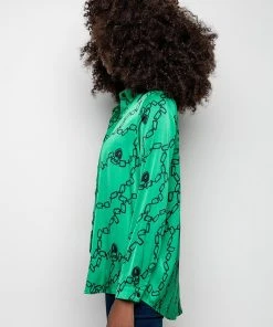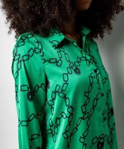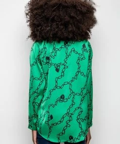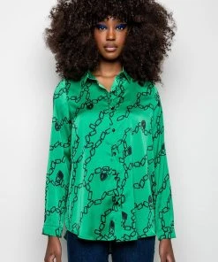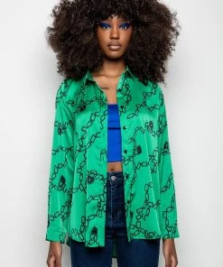 The AKIRA Label What’s New Button Up Blouse is made from a soft and shiny satin fabrication and is complete with a collared neckline, a chains, padlocks, and heart padlocks graphic print, a button up front closure, and long sleeves with button wrist details.