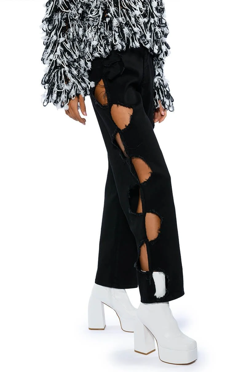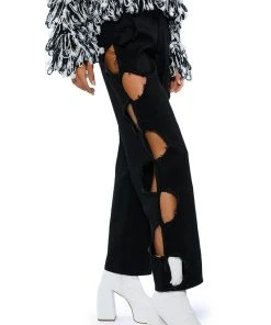 Whiteley Cut Out Relaxed Fit Jeans feature a stretch denim fabrication, a high rise waist, working belt loops, a classic five-pocket design, circular side cut out detailing, raw hem accents, and a straight leg fit. Complete with a front button and zipper closure.