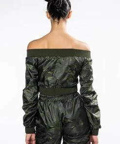 The AKIRA Label Youre The Problem Zip Up Top features a sleek nylon fabrication, long sleeves, an off the shoulder silhouette, a cropped cut, and wide ribbed knit hems. Complete with a tonal zip front closure and camo print patterning. Pair with the coordinating AKIRA Label Youre The Problem Jogger for a complete look.